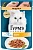 Нежный корм в соусе. Всегда попадается свежий, с большим сроком. Пакетик-пауч небольшой. Одна штука - одна порция. Накладываю консерву своему питомцу, и он тут же бежит, облизываясь. Текстура отличная, быстро переваривается организмом.