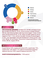 Добавленные вещества:МЕ/кг: витамин А: 700; витамин Д3: 105; мг/кг: железо: 8,0; йод: 0,20; медь: 0,7; марганец: 1,5; цинк: 14,5; таурин: 440.