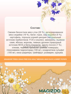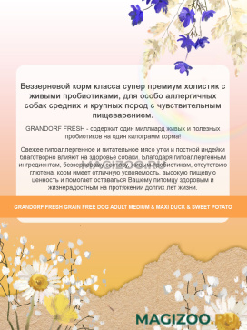 Свежее гипоаллергенное и питательное мясо утки и постной индейки благотворно влияют на здоровье собаки. Благодаря гипоаллергенным ингредиентам, беззерновому составу, живым пробиотикам, отсутствию глютена, корм имеет отличную усвояемость, высокую пищевую ценность и помогает оставаться Вашему питомцу здоровым и жизнерадостным на протяжении долгих лет жизни.