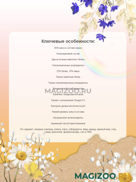 Эти богатые мясом корма не содержат ингредиенты, часто используемые в традиционных кормах, чтобы избежать пищевой непереносимости или аллергии и полностью удовлетворят биологическую потребность питомцев в мясном питании.