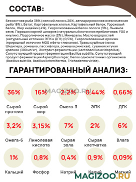 Состав: бескостная рыба 38% (свежий лосось 20%, дегидрированная океаническая рыба 18%), Батат, Картофельные хлопья, Картофельный белок, Гороховый белок, Жир индейки (4%), Гидролизованный белок лосося (3%), Льняное семя, Порошок корней цикория (натуральный источник пребиотиков: FOS и инулин), Подсолнечное масло (2%), Минералы, Масло водорослей (натуральный источник ЭПК и ДГК) (0,5%), Гидролизованные дрожжи (природный источник MOS и бета-глюканов), Травы сушёные (юкка Шидигера, ромашка, пассифлора, ромашка римская), сушеная жгучая крапива (300 мг/кг), Экстракт ферментации (Lactobacillus acidophilus), Сопутствующий продукт ферментации Bacillus subtilis, Сопутствующий продукт ферментации Aspergillus niger, Белок одноклеточных организмов (Bacillus subtilis, Bacillus licheniformis, Trichoderma viride).