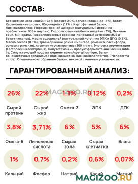 Состав: бескостное мясо индейки 35% (свежее 20%, дегидрированное 15%), Батат, Картофельные хлопья, Жир индейки (12%), Картофельный белок, Лигноцеллюлоза, Порошок корней цикория (натуральный источник пребиотиков: FOS и инулин), Гидролизованный белок индейки (3%), Льняное семя, Минералы, Гидролизованные дрожжи (природный источник MOS и бета-глюканов), Масло водорослей (натуральный источник ЭПК и ДГК) (0,5%), Масло лосося (0,5%), Травы сушёные (юкка Шидигера, ромашка, пассифлора, ромашка римская), сушеная жгучая крапива (300 мг/кг), Экстракт ферментации (Lactobacillus acidophilus), Сопутствующий продукт ферментации Bacillus subtilis, Сопутствующий продукт ферментации Aspergillus niger, Белок одноклеточных организмов (Bacillus subtilis, Bacillus licheniformis, Trichoderma viride). Специально отобранные белки с высокой степенью усвояемости.