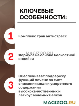 - Обеспечивает поддержку функций печени за счет снижения меди и умеренного содержания высококачественных и легкоусвояемых белков.