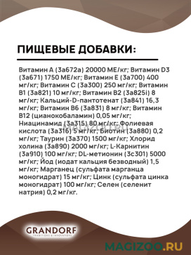 Пищевые добавки: Витамин A (3a672a) 20000 МЕ/кг; Витамин D3 (3а671) 1750 МЕ/кг; Витамин Е (3а700) 400 мг/кг; Витамин C (3a300) 250 мг/кг; Витамин B1 (3a821) 10 мг/кг; Витамин B2 (3a825i) 8 мг/кг; Кальций-D-пантотенат (3a841) 16,3 мг/кг; Витамин B6 (3a831) 8 мг/кг; Витамин B12 (цианокобаламин) 0,05 мг/кг; Ниацинамид (3a315) 80 мг/кг; Фолиевая кислота (3a316) 5 мг/кг; Биотин (3a880) 0,2 мг/кг; Таурин (3a370) 1500 мг/кг; Хлорид холина (3a890) 2000 мг/кг; L-Карнитин (3a910) 100 мг/кг; DL-метионин (3c301) 5000 мг/кг; Йод (иодат кальция безводный) 1,5 мг/кг; Марганец (сульфата марганца моногидрат) 15 мг/кг; Цинк (сульфата цинка моногидрат) 100 мг/кг; Селен (селенит натрия) 0,2 мг/кг.