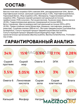 Состав: бескостное мясо индейки 32% (свежее 20%, дегидрированное 12%), Батат, Картофельные хлопья, Цельные сушеные яйца (7,5%), Картофельный белок, Гороховый белок, Жир индейки (4%), Минералы, Гидролизованный белок индейки (3%), Порошок корней цикория (натуральный источник пребиотиков: FOS и инулин), Лигноцеллюлоза, Льняное семя, Масло лосося (0,5%), Гидролизованные дрожжи (природный источник MOS и бета-глюканов), Масло водорослей (натуральный источник ЭПК и ДГК) (0,5%), Травы сушёные (юкка Шидигера, ромашка, пассифлора, ромашка римская), Сушеная клюква (300 мг/кг), Экстракт ферментации (Lactobacillus acidophilus), Сопутствующий продукт ферментации Bacillus subtilis, Сопутствующий продукт ферментации Aspergillus niger, Белок одноклеточных организмов (Bacillus subtilis, Bacillus licheniformis, Trichoderma viride).
