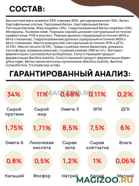 Состав: бескостное мясо индейки 33% (свежее 20%, дегидрированное 13%), Батат, Картофельные хлопья, Гороховый белок, Картофельный белок, Лигноцеллюлоза, Жир индейки (3%), Гидролизованный белок индейки (3%), Минералы, Льняное семя, Порошок корней цикория (натуральный источник пребиотиков: FOS и инулин), Пивные дрожжи (природный источник MOS и бета-глюканов), Гидролизованные дрожжи (природный источник MOS и бета-глюканов), Масло водорослей (натуральный источник ЭПК и ДГК) (0,5%), Масло лосося (0,5%), Травы сушёные (юкка Шидигера, ромашка, пассифлора, ромашка римская), Сушеная клюква (300 мг/кг), Экстракт ферментации (Lactobacillus acidophilus), Сопутствующий продукт ферментации Bacillus subtilis, Сопутствующий продукт ферментации Aspergillus niger, Белок одноклеточных организмов (Bacillus subtilis, Bacillus licheniformis, Trichoderma viride).