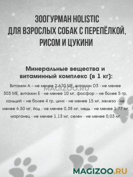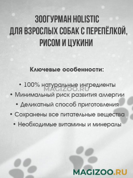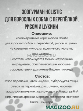 Гипоаллергенный корм класса Holistic для взрослых собак с перепёлкой, рисом и цукини.