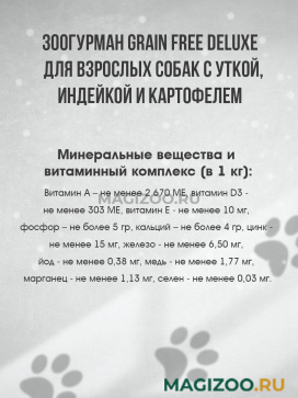 Филе утки, мясо индейки, субпродукты индейки, бульон из утки, картофель батат, морковь, масло растительное, желирующая добавка, рыбий жир, пивные дрожжи, морские водоросли, экстракт Юкка Шидигера.