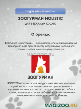 Информация о составе и ингредиентах, цветовом решении, технических и иных характеристиках, стране-изготовителе, внешнем виде и комплекте поставки товара носит справочный характер и основана на последних доступных к моменту публикации сведениях. Доставка данного товара осуществляется во все регионы РФ.ЗООГУРМАН производит натуральные мясные консервы, сухой корм, каши моментального приготовления и сушеные мясные лакомства, рассчитанные на собак и кошек, владельцы которых заботятся о качественном и полноценном питании для своих любимцев.