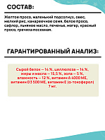 Витамин А (3a672a) – 24000 МЕ, витамин D3 (3a671) – 1320 МЕ, витамин Е (3а700) – 720 мг, витамин B1 (3a820) – 9,60 мг, витамин B2 – 60 мг, витамин B6 (3a831) – 60 мг, витамин B12 – 0,12 мг, ниацинамид (3а315) - 168 мг, биотин (3a880) - 9,60 мг, фолиевая кислота (3a316) - 2,40 мг, D-пантотенат кальция (3a841) - 60 мг, витамин С (3a300) - 180 мг, бета-каротин (3a160(a)) - 60 мг, холина хлорид (3a890) - 2500 мг, цинк (3b6.10) (Хелат цинка с метионин гидрокси-аналогом) - 120 мг, марганец (3b5.10) (Хелат марганца с метионин гидрокси-аналогом) - 30 мг, железо (3b106) (Железа (II) хелат аминокислоты гидрат) - 120 мг, медь (3b4.10) (Хелат меди с метионин гидрокси-аналогом) - 12 мг, DL-метионин (3c301) - 4000 мг, таурин (3a370) - 4000 мг, L-карнитин (3a910) - 500 мг.