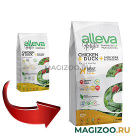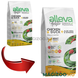 Полнорационный беззерновой корм для взрослых собак средних пород с курицей, уткой, алоэ вера и женьшенем.