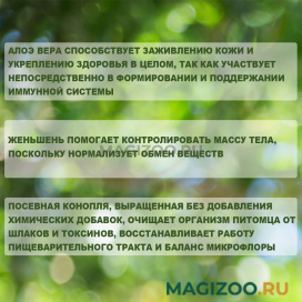 - Посевная конопля, выращенная без добавления химических добавок, очищает организм питомца от шлаков и токсинов, восстанавливает работу пищеварительного тракта и баланс микрофлоры кишечника.