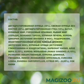 Дегидратированная курица (35%), свежая курица без костей (20%), дегидратированная утка (10%), батат, куриный жир, гороховый крахмал, рыбий жир (сельди), волокна гороха, куриная печень, корень цикория (источник инулина и ФОС), подорожник, инактивированные сухие пивные дрожжи (источник МОС), куриные хрящи (источник глюкозамина и хондроитина), карбонат калия, Алое вера (0,10%), корень женьшеня (Panax ginseng) (0,10%), розмарин лекарственный, куркума длинная, гвоздика, лимон (Rosmarinus officinalis, Curcuma longa, Eugenia caryophyllus, Citrus sp.) - (0,05%), сок юкки.