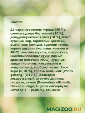 Состав: дегидратированная курица (45 %), свежая курица без костей (20 %), дегидратированная утка (10 %), батат, куриный жир, гороховый крахмал, рыбий жир (сельди), куриная печень, корень цикория (источник инулина и ФОС), волокна гороха, подорожник, инактивированные сухие пивные дрожжи (источник МОС), куриные хрящи (источник глюкозамина и хондроитина), карбонат калия, Алое вера (0,10 %), корень женьшеня (Panax ginseng) (0,10 %), розмарин лекарственный, куркума длинная, гвоздика, лимон (Rosmarinus officinalis, Curcuma longa, Eugenia caryophyllus, Citrus sp.) — (0,05 %), сок юкки.
