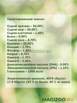 Энергетическая ценность: 4070 кКал/кг; 17,0 МДж/кг (33 % от белка, 45 % от жира).
