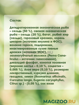 Дегидратированная океаническая рыба – сельдь (50 %), свежая океаническая рыба – сельдь (20 %), батат, рыбий жир (сельди), гороховый крахмал, корень цикория (источник инулина и ФОС), волокна гороха, подорожник, инактивированные сухие пивные дрожжи (источник МОС), зеленогубчатый моллюск (Perna Canaliculus – источник глюкозамина), дикальций фосфат, конопля посевная (верхние листья – 0,10 %, соцветия – 0,005 %), Алое вера (0,10 %), розмарин лекарственный, куркума длинная, гвоздика, лимон (Rosmarinus officinalis, Curcuma longa, Eugenia caryophyllus, Citrus sp.) - (0,05 %), сок юкки.