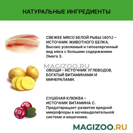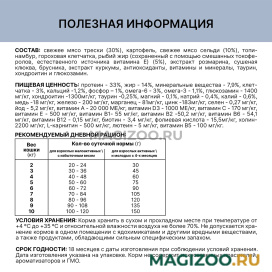 Состав: свежее мясо трески (30%), картофель, свежее мясо сельди (10%), топинамбур, гороховая клетчатка, рыбий жир (сохраненный с помощью смешанных токоферолов, естественного источника витамина Е) (5%), экстракт розмарина, сушеная клюква, брусника, экстракт куркумы, антиоксиданты, витамины и минералы, таурин, хондроитин и глюкозамин.