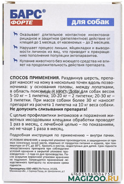 Инсекто-акарицидные капли Барс форте оказывают губительное действие на личинок и половозрелых клещей семейства Ixodidae, клещей Sarcoptes canis и Cheyletiella jascuri и насекомых Linognathus setosus, Trichodectes canis и Ctenocephalides canis. Высокая инсекто-акарицидная активность капель обусловлена наличием в их составе фипронила и регулятора роста насекомых. Механизм действия фипронила заключается в блокировании ГАМК-зависимых рецепторов паразита и нарушении нервно-мышечной передачи, что приводит к его параличу и гибели. Регулятор роста насекомых ингибирует процессы хитинообразования, нарушает процессы линьки, окукливания и окрыления паразита. Препарат по степени воздействия на организм теплокровных животных относится к умеренно опасным веществам и в рекомендуемых дозах не оказывает тератогенного, эмбриотоксического и местнораздражающего действия.