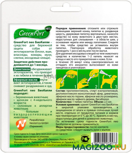 Средства GREEN FORT NEO:• Новая усиленная формула! Репелленты + диметикон. Обеспечивает двойную защиту животных от эктопаразитов.• Бережная защита. Безопасны для беременных и кормящих самок, детенышей, больных, выздоравливающих и склонных к аллергии животных.• Защищают кошек, собак, кроликов и грызунов от иксодовых клещей, блох, вшей, власоедов, комаров, мух и слепней на срок до 90 дней (в зависимости от вида средства).