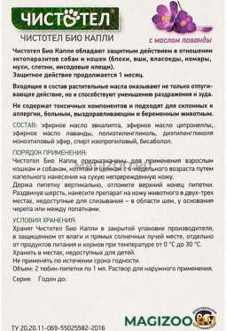 Средство Чистотел Био Капли обладает защитным действием в отношении эктопаразитов собак и кошек (блохи, вши, власоеды, комары, мухи, слепни, иксодовые клещи). Защитное действие продолжается 1 месяц.