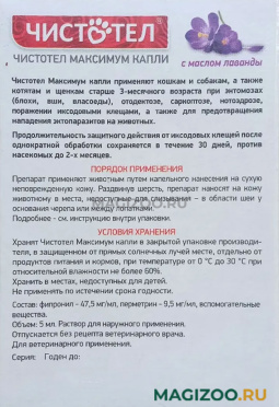 ЧИСТОТЕЛ МАКСИМУМ капли применяют собакам и кошкам, а также щенкам и котятам старше 3-месячного возраста при энтомозах (блохи, вши, власоеды), отодектозе, саркоптозе, нотоэдрозе, поражении иксодовыми клещами. Защищает от блох и вшей до двух месяцев, от клещей до одного месяца.