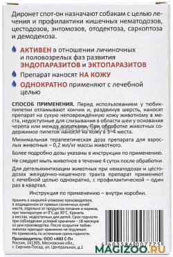 Диронет спот-он обладает высокой эффективностью в отношении ряда опасных и широко распространенных паразитов у собак, таких как круглые и ленточные гельминты: Toxascaris leonina, Toxocara mystax, Uncinaria stenocephala, Ancylostoma spp., Trichuris vulpis, Echinococcusgranulosus, Echinococcus multilocularis, Multiceps multiceps, Mesocestoides lineatus, Diphyllobothrium latum, Dipylidium caninum, Taenia spp.; насекомые: Linognathus setosus, Trichodectes canis,Ctenocephalides felis; саркоптоидные клещи: Sarcoptes cati, Notoedres cati, Otodectes cynotis. Механизм действия ивермектина заключается в изменении им величины тока ионов хлора через мембраны нервно-мышечных клеток паразита. Основной мишенью являются глутамат-чувствительные хлорные каналы, а также ГАМК-рецепторы. Изменение тока ионов хлора нарушает проведение нервных импульсов, что приводит к параличу и гибели паразита. Механизм действия празиквантела основан на нарушении транспорта глюкозы и микротубулярной функции цестод, угнетении активности фумарат-редуктазы и синтеза АТФ, повышении проницаемости клеточных мембран для ионов кальция, что приводит к нарушению нервно-мышечной иннервации, параличу и гибели паразита. Диронет спот-он по степени воздействия на организм теплокровных животных относится к умеренно опасным веществам и в рекомендуемых дозах не оказывает местнораздражающего, резорбтивно-токсического и сенсибилизирующего действия.