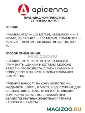 Празицид комплекс НЕО в 1 мл содержит в качестве действующих веществ: празиквантел - 100 мг, ивермектин - 5 мг, фипронил - 100 мг; вспомогательные вещества: диметилсульфоксид, полиэтиленгликоль-400, отдущка «Blue River», бутилгидрокситолуол, бутилгидроксианизол и бензиловый спирт.
