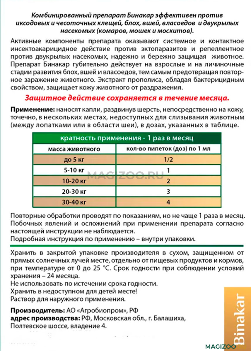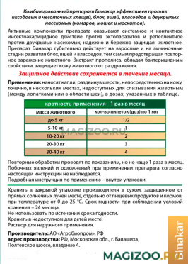 Препарат Бинакар используют для уничтожения эктопаразитов (иксодовых и чесоточных клещей, блох, вшей, власоедов) на собаках и щенках, а также для защиты от нападения двукрылых насекомых (комаров, мошек и москитов).