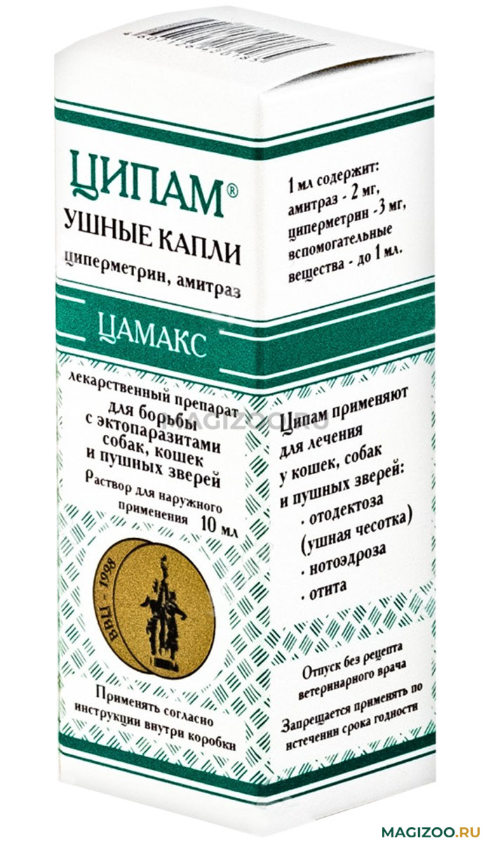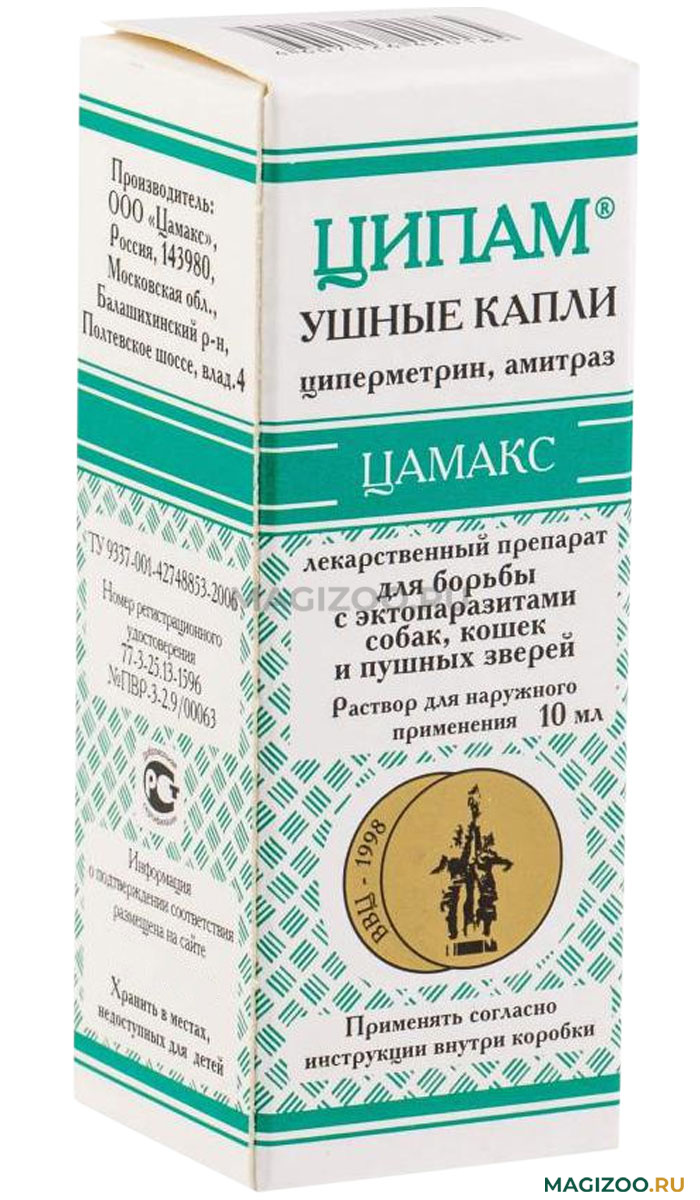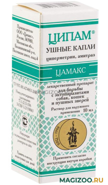 При отодектозе (ушной чесотке) собак, кошек и пушных зверей наружный слуховой проход очищают от струпьев и корок тампоном, смоченным Ципамом, и затем закапывают его в каждое ухо по 3 – 6 капель (в зависимости от размера животного). С целью более полной обработки всей поверхности уха и слухового прохода ушную раковину складывают вдоль пополам и слегка массируют ее основание. Обработку проводят двукратно с интервалом 3 – 5 дней. В запущенных случаях отодектоза, осложненных отитами, назначают антибактериальные и противовоспалительные средства. При необходимости курс лечения повторяют. Препарат обязательно вводят в оба слуховых прохода, даже в случаях поражения отодектозом только одного уха. При поражении собак и кошек саркоптоидозами (псороптоз, саркоптоз, нотоэдроз) и собак демодекозом препарат наносят на предварительно очищенные от струпьев и корок пораженные места капельно или струей из расчета 0,5 – 1 мл/кг массы животного (10 капель на 100 см2 поверхности тела), а затем равномерно распределяют от периферии к центру с захватом здоровой пограничной кожи до 1 см. Для предотвращения слизывания препарата животным надевают намордник или смыкают челюсти петлей из тесьмы, которые снимают через 15 – 20 минут после нанесения препарата. Обработку проводят 2 – 3 раза в неделю до клинического выздоровления, которое подтверждают двумя отрицательными результатами акарологических исследований. Животных с обширными участками поражения кожи обрабатывают в два приема с интервалом один день, нанося препарат сначала на одну половину пораженной поверхности туловища, а затем на другую. Для уничтожения вшей, блох и власоедов животных обрабатывают препаратом из расчета 0,5 – 1 мл на 100 см2 поверхности тела (в зависимости от состояния шерстного покрова). Раздвинув шерсть, препарат наносят на кожу туловища тонкой струйкой, проводя линии с интервалом 3 – 4 см от головы к хвосту. Через 15 – 20 минут шерсть животного расчесывают. Повторные обработки проводят по энтомологическим показаниям, но не чаще одного раза в 10 дней. В целях предотвращения выплода блох и реинвазии животных, подстилки, попоны и другие предметы ухода за животными, а также поверхности пола и стен в нежилых помещениях (конуры, будки, сараи и т. п.) обрабатывают препаратом Ципам из расчета 1 мл/м2 поверхности, не допуская в течение 3 дней их контакта с животными. По окончании экспозиции препарат удаляют с поверхности помещений влажным способом, подстилки и попоны стирают с моющим средством. Для уничтожения иксодовых клещей на теле животного препарат в количестве 1 – 2 капель наносят на клеща и место его прикрепления к коже. Если в течение 15 минут клещ самопроизвольно не отпадает, то его аккуратно вытаскивают из тела животного и уничтожают.
