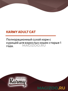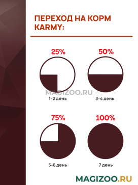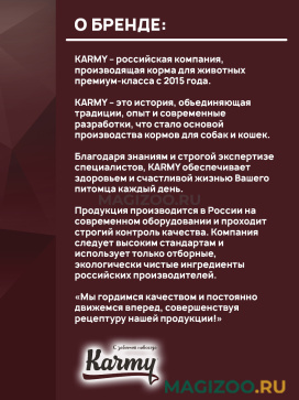 Информация о составе и ингредиентах, цветовом решении, технических и иных характеристиках, стране-изготовителе, внешнем виде и комплекте поставки товара носит справочный характер и основана на последних доступных к моменту публикации сведениях. Доставка данного товара осуществляется во все регионы РФ.KARMY – это история, объединяющая традиции, опыт и современные разработки, что стало основой производства кормов для собак и кошек.