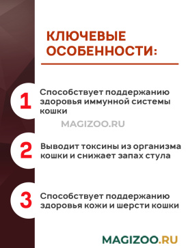 - Способствует поддержанию здоровья кожи и шерсти кошки.