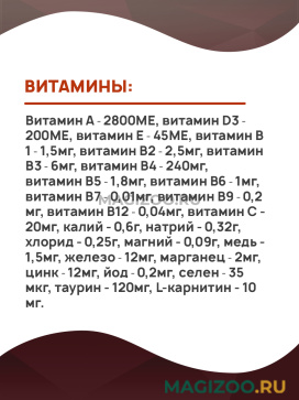 Витамин А ⎼ 2800МЕ, витамин D3 ⎼ 200МЕ, витамин Е ⎼ 45МЕ, витамин В1 ⎼ 1,5мг, витамин В2 ⎼ 2,5мг, витамин В3 ⎼ 6мг, витамин В4 ⎼ 240мг, витамин В5 ⎼ 1,8мг, витамин В6 ⎼ 1мг, витамин В7 ⎼ 0,01мг, витамин В9 ⎼ 0,2мг, витамин В12 ⎼ 0,04мг, витамин С - 20мг, калий - 0,6г, натрий - 0,32г, хлорид - 0,25г, магний - 0,09г, медь - 1,5мг, железо ⎼ 12мг, марганец ⎼ 2мг, цинк ⎼ 12мг, йод ⎼ 0,2мг, селен ⎼ 35мкг, таурин - 120мг, L-карнитин - 10мг.