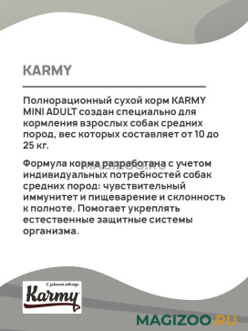 Полнорационный сухой корм KARMY MINI ADULT создан специально для кормления взрослых собак средних пород, вес которых составляет от 10 до 25 кг.
