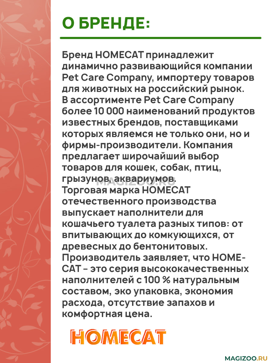 Торговая марка HOMECAT отечественного производства выпускает наполнители для кошачьего туалета разных типов: от впитывающих до комкующихся, от древесных до бентонитовых. Производитель заявляет, что HOMECAT – это серия высококачественных наполнителей с 100 % натуральным составом, эко упаковка, экономия расхода, отсутствие запахов и комфортная цена.