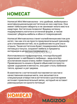 Homecat Мятная волна станет излюбленным местом для кота или кошечки, так как это не просто привлекательный тренажёр для стачивания когтей, но и удобное место для сна и отдыха. Такая когтеточка будет поддерживать Вашего питомца в тонусе, сохранит мебель и предметы интерьера в целости и сохранности.
