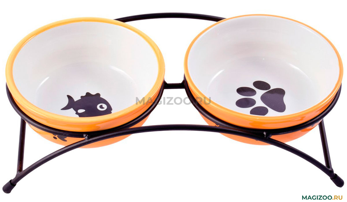 Порадуйте своего питомца подставкой с двумя яркими мисками, которые не будут «убегать» от него во время еды, благодаря резиновым ножкам.