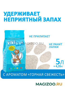 Наполнитель KikiKat Mountain Fresh Scented из натуральной белой бентонитовой глины с ароматом горной свежести, специально разработан для лучшего контроля запаха. Помогает кошкам чувствовать себя в естественной среде обитания.