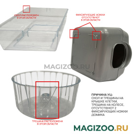 Клетка имеет прочную конструкцию, изготовленную из окрашенной металлической решетки, оснащена удобной дверцей на крыше, закрывающейся на защелки во избежание случайных побегов. Поддон для наполнителя и опилок изготовлен из прочного пластика и легко отсоединяется от верхней части для облегчения уборки.