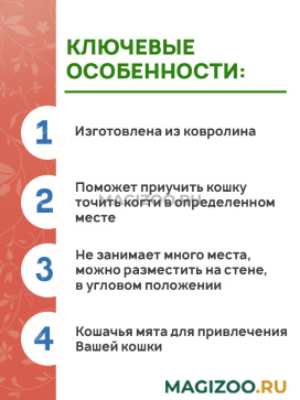 Когтеточка предназначена для стачивания когтей, позволяет снимать огрубевшие кончики и предотвращает врастание когтей - кот доволен и мебель в порядке! Волокна ковролина обеспечивают естественный уход за когтями питомца.