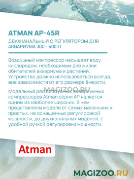 Модельный ряд воздушных аквариумных компрессоров Atman серии AP является одним из наиболее широких. В нем представлены модели от самых маленьких и простых, не оснащенных регулировкой мощности, до двухканальных моделей, с удобной ручкой регулировки мощности.