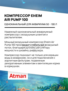 Мощный воздушный компрессор Eheim Air Pump 100 производит стабильный воздушный поток, благодаря ручному регулятору мощности и дизайну диффузора.