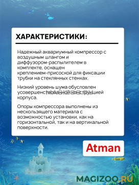 Особенности компрессора: для пресноводного аквариума, для морского аквариума, одноканальный, тихий, регулятор потока воды.