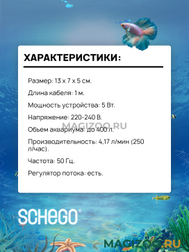 Особенности компрессора: для пресноводного аквариума, одноканальный, мембранный, регулятор потока воды, тихий.
