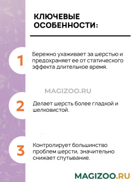 Придает превосходный блеск и кондиционирует, не изменяя породную текстуру шерсти.