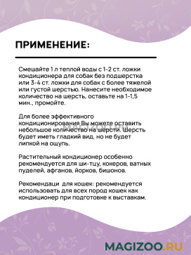 Растительный кондиционер особенно рекомендуется для ши-тцу, кокеров, ватных пуделей, афганов, йорков, бишонов.