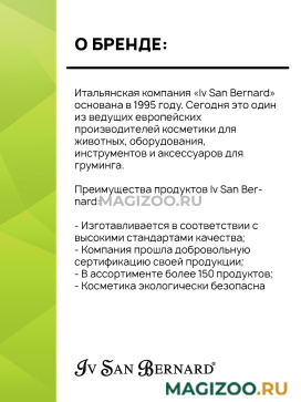 Iv San Bernard — первая в мире компания, которая разделила продукцию на три категории для различных типов шерсти: короткой, средней и длинной. Такая классификация сделана исходя из свойств шерстного покрова и разных потребностей питания для каждого типа шерсти.