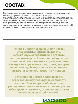 Лёгкая сыворотка объединяет мягкий ультралёгкий крем и жидкость, насыщенную активными веществами: экстрактом морской водоросли Каулерпы (известной, как «зеленая икра»), маслами макадамии и гранатовых косточек, которые мгновенно действуют, восстанавливают, питают и оживляют шерстный покров.