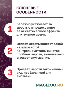 Придает превосходный блеск и кондиционирует, не изменяя породную текстуру шерсти.