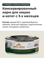 Корм Almo Nature HFC Complete с курицей и зелёным горошком в бульоне— это сбалансированный рацион, созданный для удовлетворения всех потребностей Вашего питомца. Нежная курица обеспечивает организм Вашего питомца легкоусвояемым белком, необходимым для поддержания мышечной массы и энергии. Зелёный горошек — это источник растительных белков, клетчатки и витаминов, которые способствуют здоровью пищеварительной системы и укреплению иммунитета. Тапиока добавляет рациону лёгкость, а подсолнечное масло помогает поддерживать блеск шерсти и здоровье кожи.