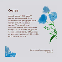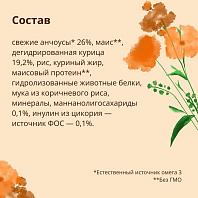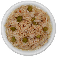 Состав: курица 55 %, куриный бульон, тапиока, зеленый горошек, подсолнечное масло, минералы, витамины